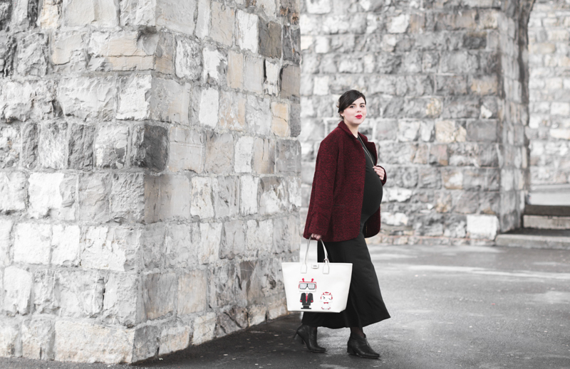 Robe POLO RALPH LAUREN via Luisaviaroma – Manteau NOT SO FAR – Boots ATALANTA WELLER via YoungBritishDesigners – Collants plumetis femme enceinte via LA REDOUTE – Sac Cabas Karl Robot KARL LAGERFELD – Pendentif Bola de grossesse ILADO