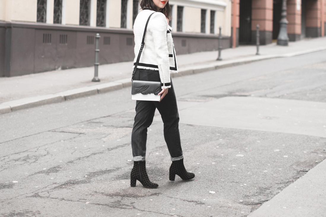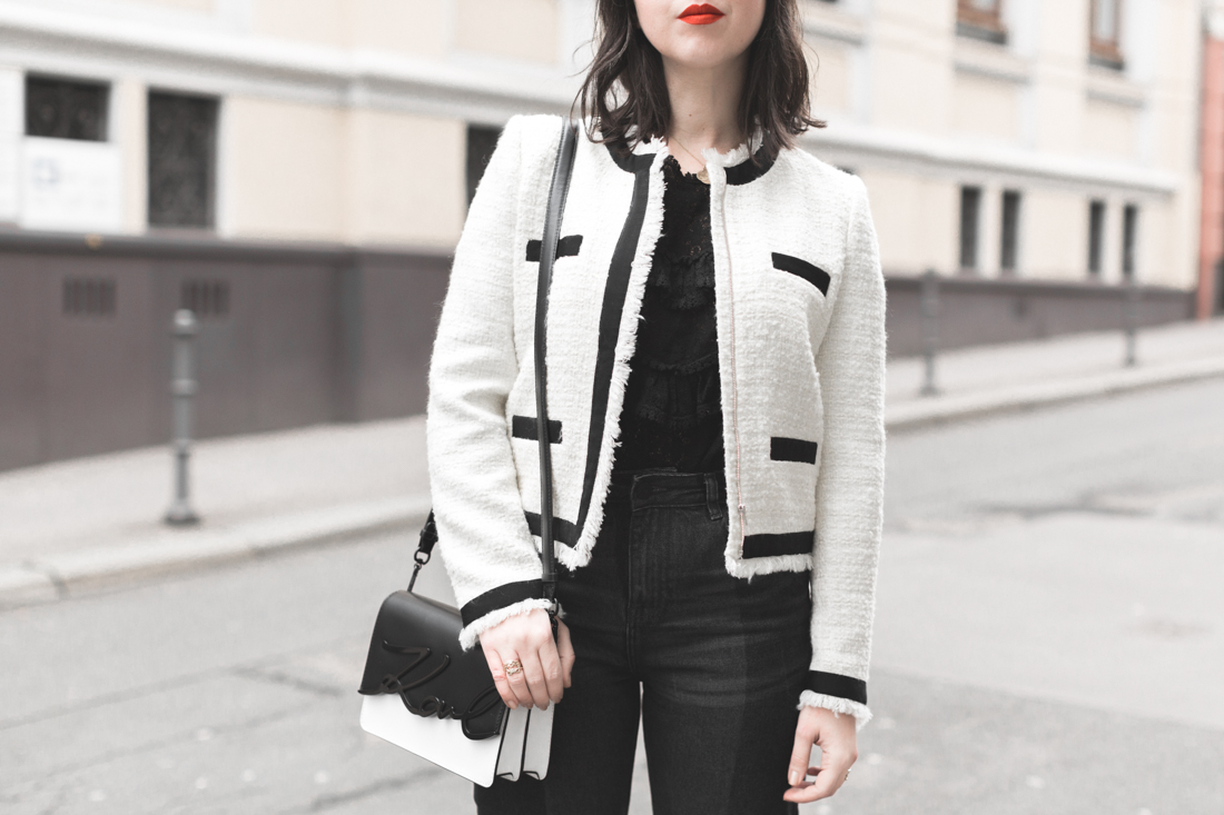 Du coup, forcément, qui dit veste en tweed dit Chanel, qui dit Chanel dit Karl Lagerfeld donc il m’a paru évident que j’allais vous montrer cette veste le jour du concours Karl Lagerfeld. Et comme il y avait un joli sac bicolore noir et blanc dans la sélection de 3 sacs, le choix s’est imposé de lui-même ! Pour autant, je dois vous avouer que je suis dingue des 3 modèles proposés. La minaudière en perspex qui représente Karl et ses mythiques lunettes de soleil est juste géniale. Portée en bandoulière avec sa chaîne ou en clutch à la main, c’est un indémodable petit sac de soirée avec lequel on est sûre de faire son petit effet. La petite sacoche zippée en cuir et daim rose poudré décorée de perles est un bijou ! Et ce sac signature que je porte, minimaliste à première vue, mais très original en même temps, est vraiment superbe.