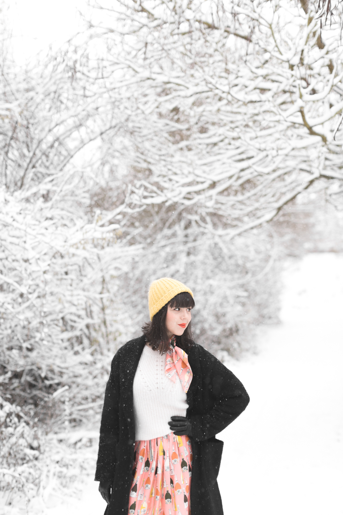 Manteau Pao et pull Oihana EKYOG – Jupe et foulard en soie imprimée Champagne HEIMSTONE – Boots cuir et tweed LA REDOUTE (de l’an dernier et surprise : elles sont à 75% soit 25€ !!! je vous les conseille vraiment, à ce prix elle défient toute concurrence ! On ne les voit pas bien car elles sont dans la neige mais elles sont vraiment parfaites, regardez ici !!)