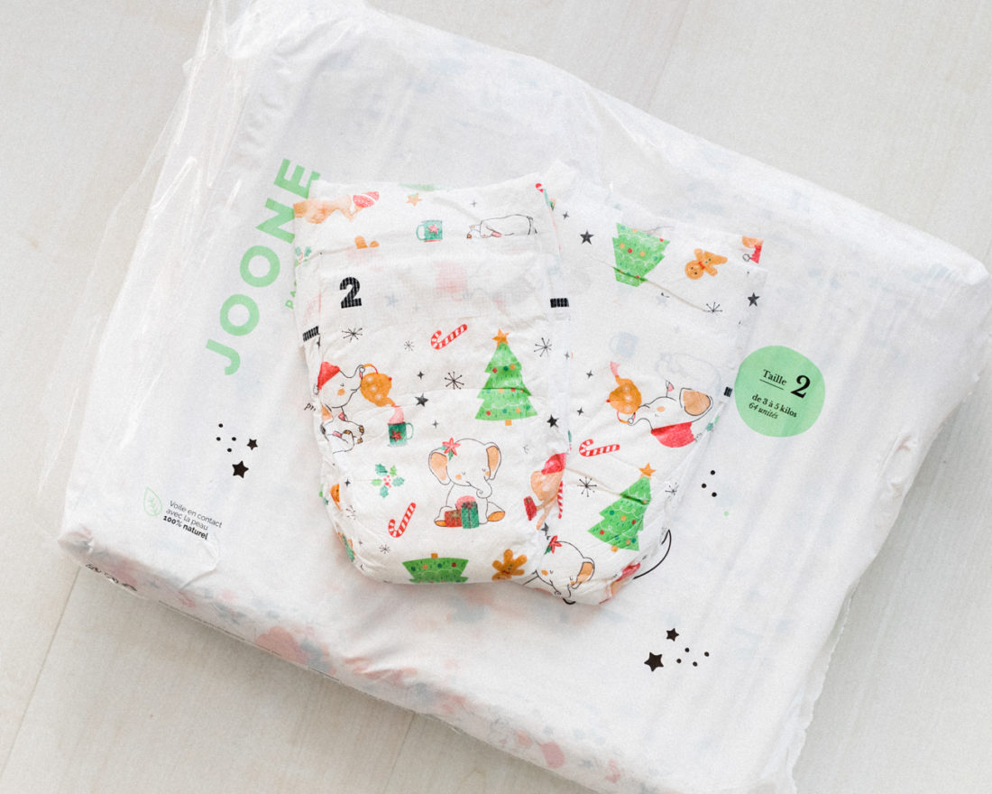 Ce coffret propose 2 paquets de couches JOONE made in France ultra clean en taille 1 et en taille 2. À partir de la taille 2, on peut choisir l’imprimé Joone de son choix et ils sont tous trop mignons ! Comme le mois de décembre arrivait, j’avais craqué sur l’imprimé de Noël absolument craquant.