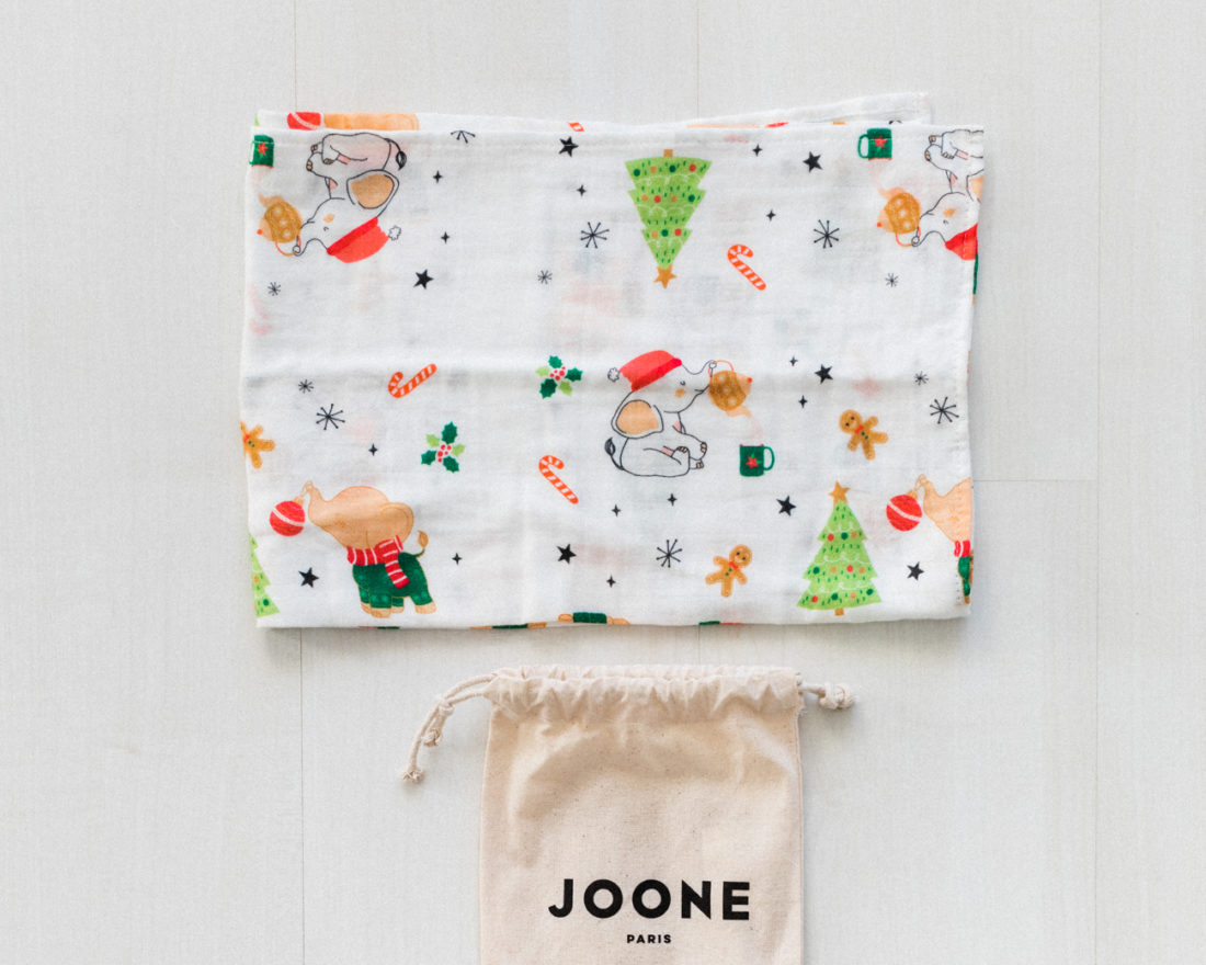 Dans ce coffret, il y avait aussi un adorable lange en coton OEKOTEX fabriqué à Paris, ici assortis aux couches : avec la mascotte de Noël JOONE, Alban le petit éléphant ! Depuis, on les collectionne et ce sont les préférés de nounou ! Ça se comprend : ils sont vraiment tout doux !