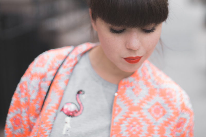 I’m wearing a neon orange ikat print light coat (a killer! people stopped me seven times in the street to tell me “hey, amazing coat, love it!” – I know new yorkers easily compliment each others, but seven times a day is a record!) ; a beautiful leopard skirt (I had been searching for this perfect skater skirt for a while!) ; a sleeveless sweater with sequin pink flamingos (who could resist the grey sweater + pink flamingo + sequins perfect combo?) and my neon orange ESSENTIEL stilettos from last year, that perfectly match the coat (except on the pictures, though… that’s the weird thing with neon colors, they’re not really photogenic).