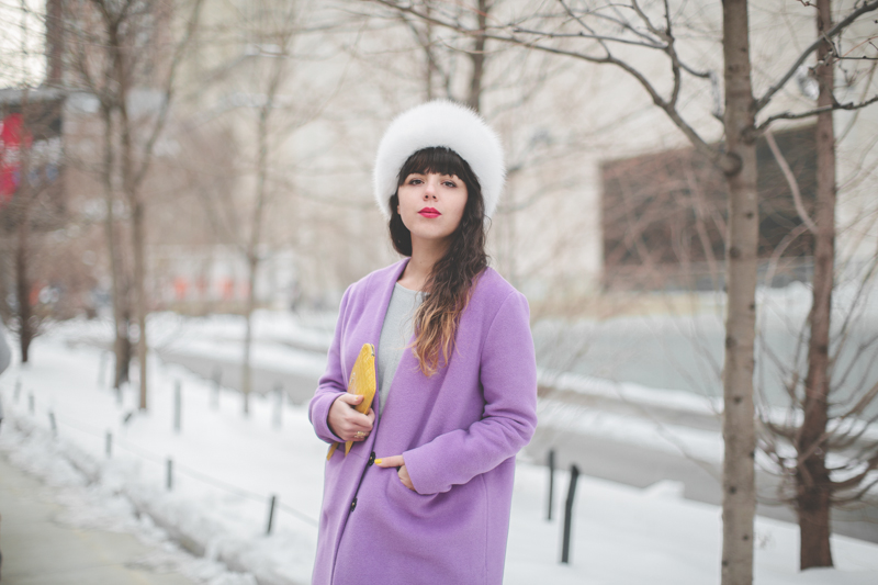 Lavender coat TOPSHOP – Skirt H&M – Sweater ROMY AND RAY – Yellow leather clutch PAULE KA – Yeloow Stilettos GEORGIA ROSE via Sarenza – Fur Hat LA CHAPKA D’ANASTASIA – Bracelets Swarovski – Tiger ring KENZO available HERE at Monnier Frères – Cashmere blend tights WOLFORD – Nails : Marc Jacobs Beauty – Lipstick PAUL & JOE Rouge 304