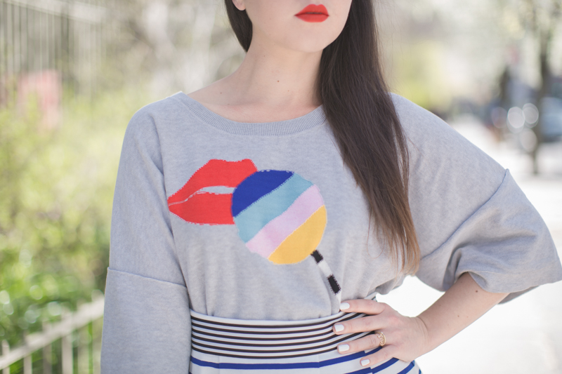 I liked mixing stripes in this outfit with the skirt, the belt (that is actually the ribbon from the present box of my Tara Jarmon’s clutch!) and the sweater’s motifs. And of course, I jumped at the chance to wear my bright red lipstick – STILA liquid lipstick STAY ALL DAY, color TESORO 08 (info here) – as a reminder of the one on the sweater!