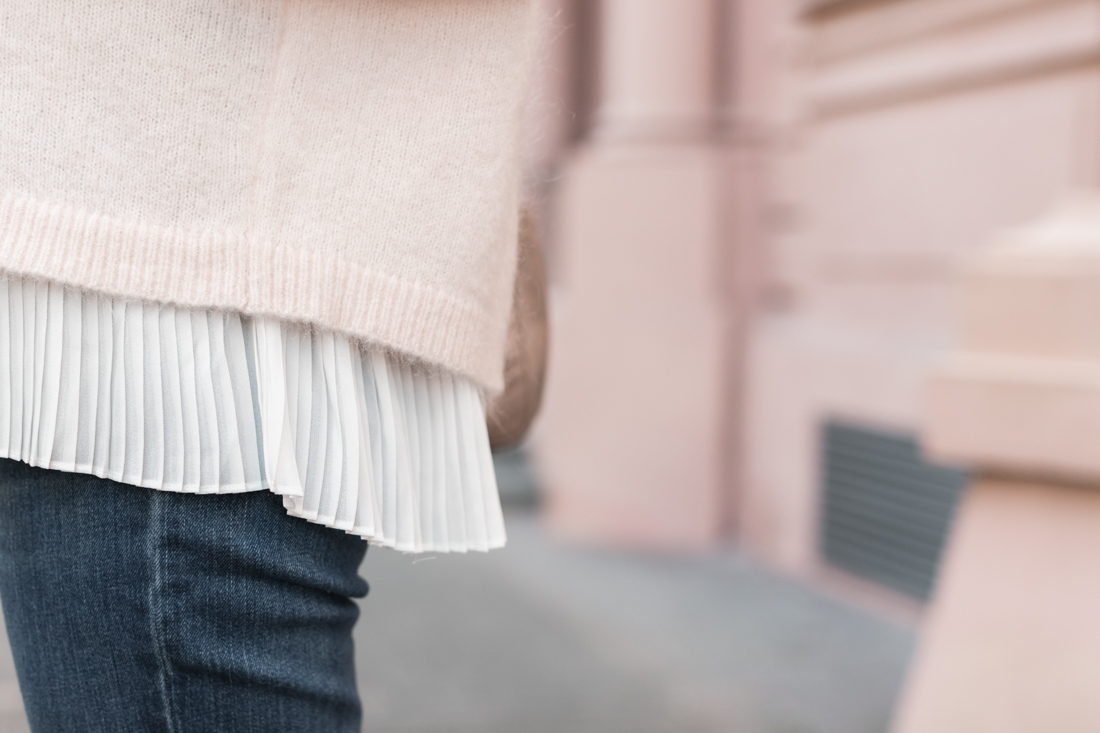 Ce pull, j’en suis folle aussi. Une maille toute fluffy, une jolie teinte poudrée, et ce dos plissé… Je craquerai bien sur le gris et le noir aussi !
