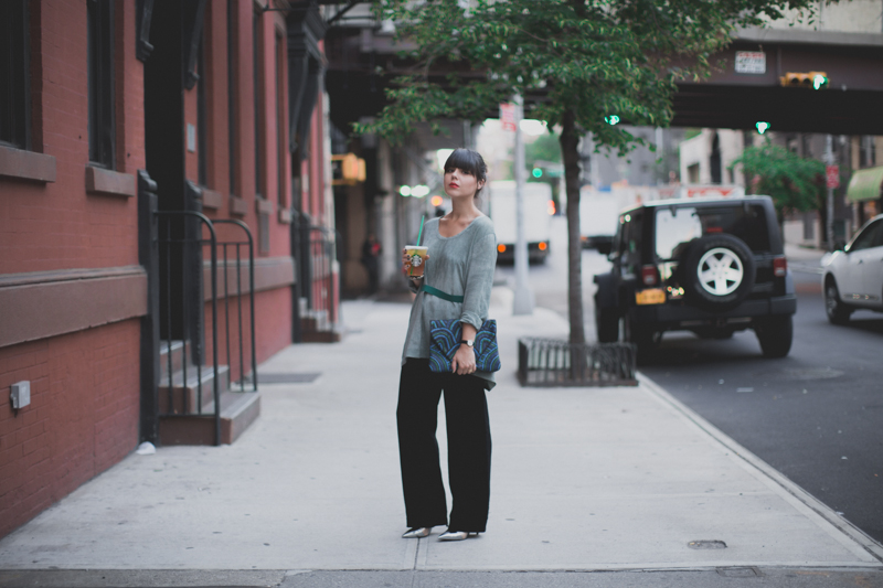 READY TO FISH est une marque de prêt-à-porter née à Amsterdam dont le style est très minimaliste et très pointu. J’ai choisi un pantalon large en laine qui est à la fois très élégant et super confortable et un top asymétrique esprit couture. J’ajoute à ça une jolie pochette en cuir tressé Antik Batik récemment acquise mais que j’adore déjà et mes escarpins argentés préférés et me voilà prête à arpenter New York en sirotant mon désormais traditionnel « iced green tea no sugar » : )