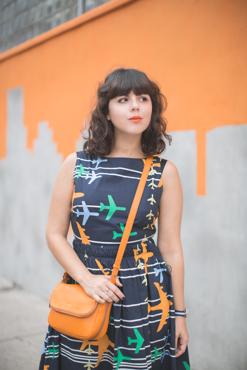 J’aime toujours autant tes photos, tu as la chance fabuleuse de pouvoir trouver des décors hyper originaux et assortis à tes tenues (la chance de vivre dans une ville telle que New-York) … Ta robe est très jolie, je n’oserais pas porter ce genre d’imprimés mais c’est tellement toi je trouve ! Et j’adore ces touches d’orange, cette couleur te va à ravir !