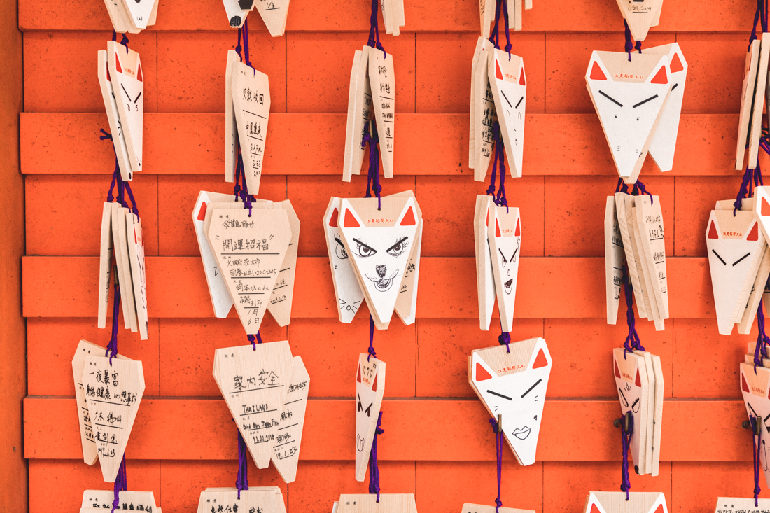On s’incline devant la Torii (la porte/arche en bois si iconique du Japon), on se purifie en se lavant les mains et en se rinçant la bouche à la petite fontaine de l’entrée, on peut faire un voeu via un rituel précis impliquant cloches et boîte à offrandes, ou des prières rituelles, en achetant des petites plaques en bois sur lesquelles on inscrit sa prière et qu’on accroche ensuite. Il y aussi des petites amulettes à l’effigie du ami en question qui sont trop mignonnes.