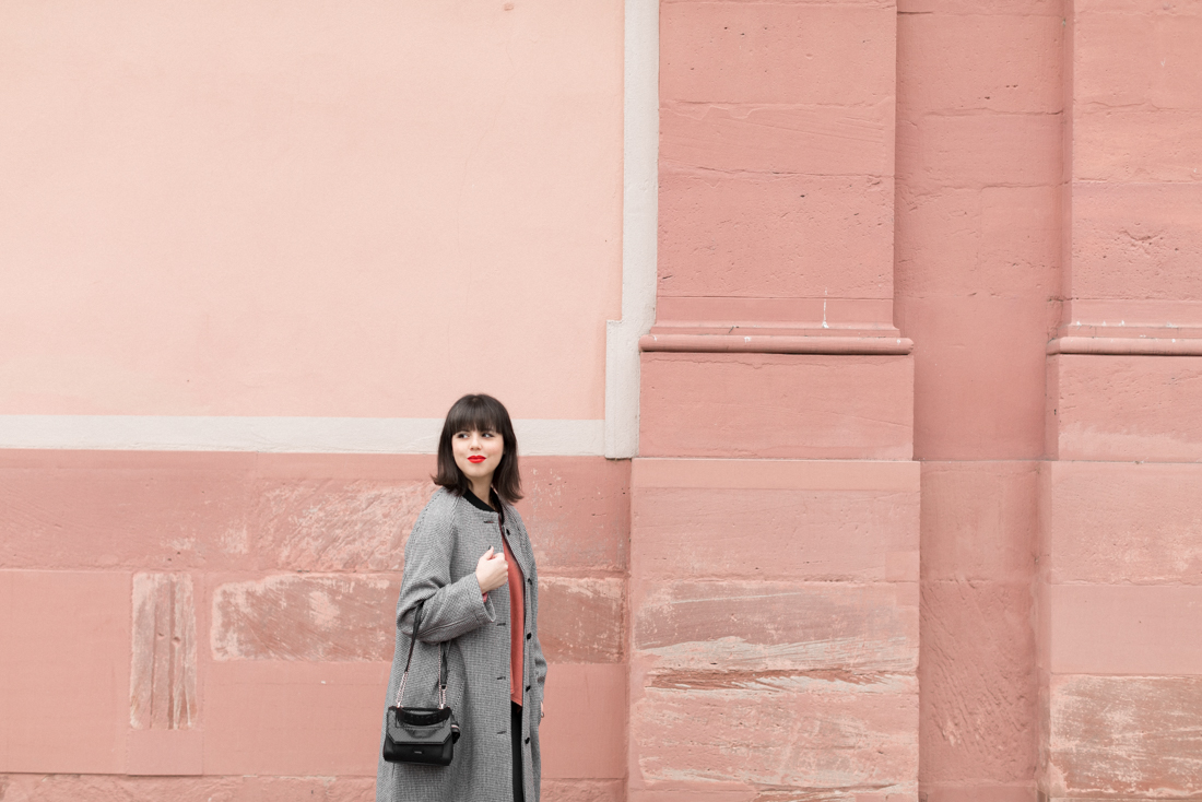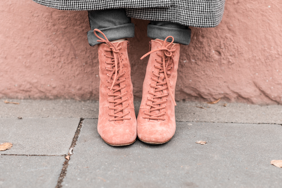 Je porte mon manteau Les Expatriés, édition limitée à 40 exemplaires, avec un slim gris dont j’adore la bande pailletée le long de la jambe, ma blouse SEZANE froncée en velours vieux rose et mes bottines lacées de l’an dernier que j’aime toujours autant !